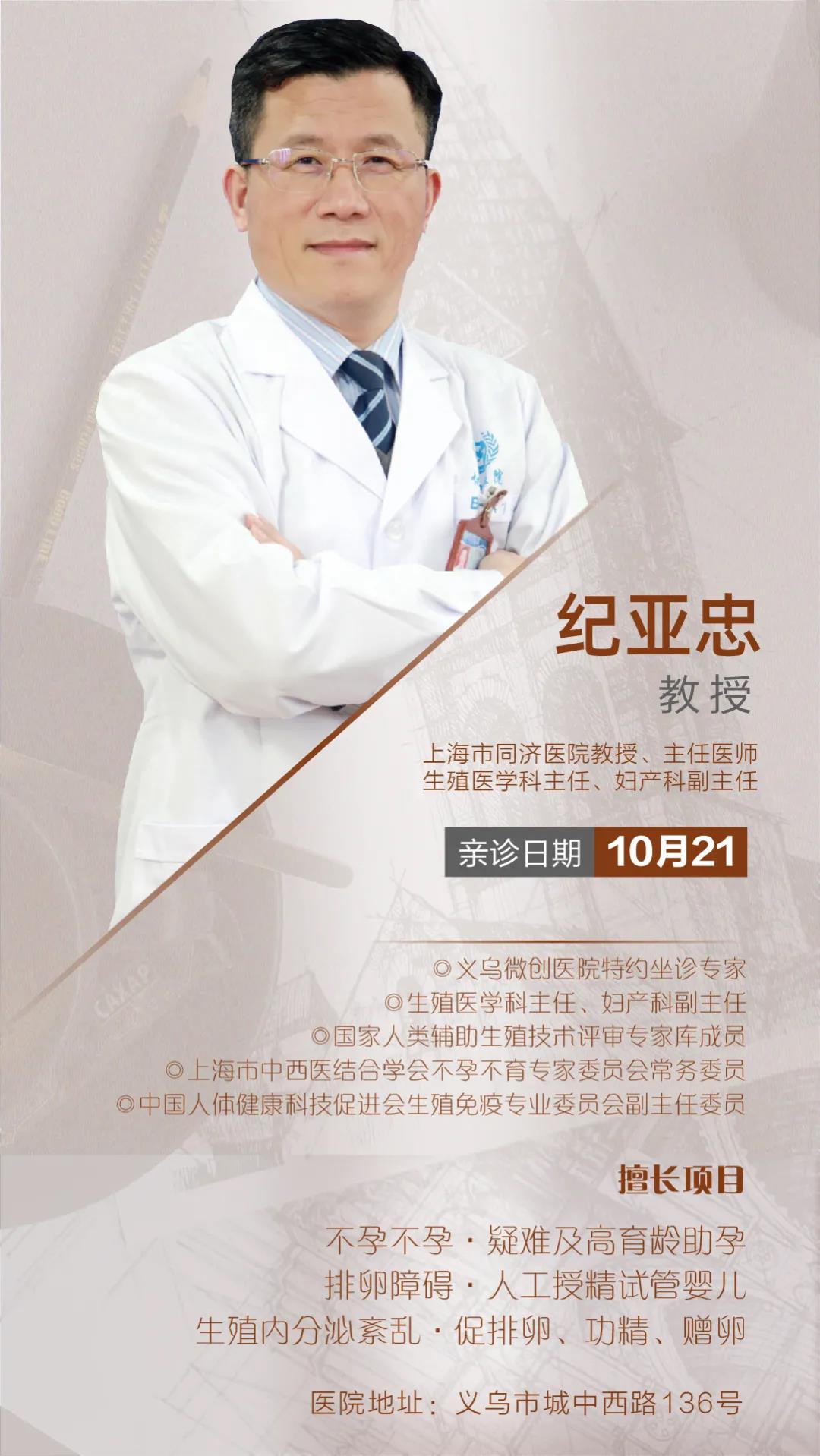 10月21日,同济大学附属上海同济医院教授、主任医师、博士生导师、生殖医学科主任、妇产科副主任纪亚忠将到院与我院不孕专家共同会诊患者,探究解决各种因素引起的不孕不育、复发性流产、多囊卵巢综合症、排卵障碍、有生殖辅助需求、试管婴儿等相关疾病问题。